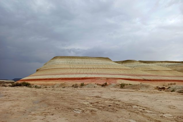 Совершим прогулки и фото у горы Бокты. Она является ещё одним памятником природы полуострова Мангистау. В переводе означает «пирог», а по визуалу слоёный пирог. Она вся урезана горизонтальными цветными полосками разных пород, что создаёт уникальность. Начиная у подножья практически с белового солончакового цвета, набирает красные узоры, уходит в желтый и ближе к середине резкий перепад в темные тона – серый, зелёный, коричневый, бордовый.